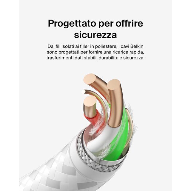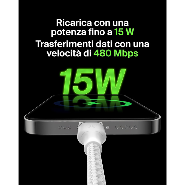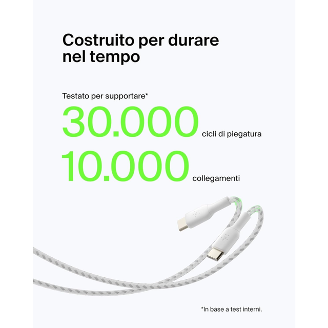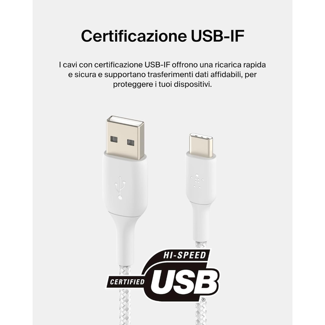Il cavo BELKIN CAB002bt1MWH è un cavo USB-C intrecciato progettato per fornire una carica veloce e una trasmissione dati affidabile. Certificato USB-IF, garantisce un'ottima interoperabilità con una vasta gamma di dispositivi USB-C, assicurando una connessione sicura e stabile. La sua fascia intrecciata in nylon gli conferisce una eccezionale resistenza, testata per resistere a più di 10.000 piegature, offrendo così una maggiore durata per un utilizzo quotidiano.